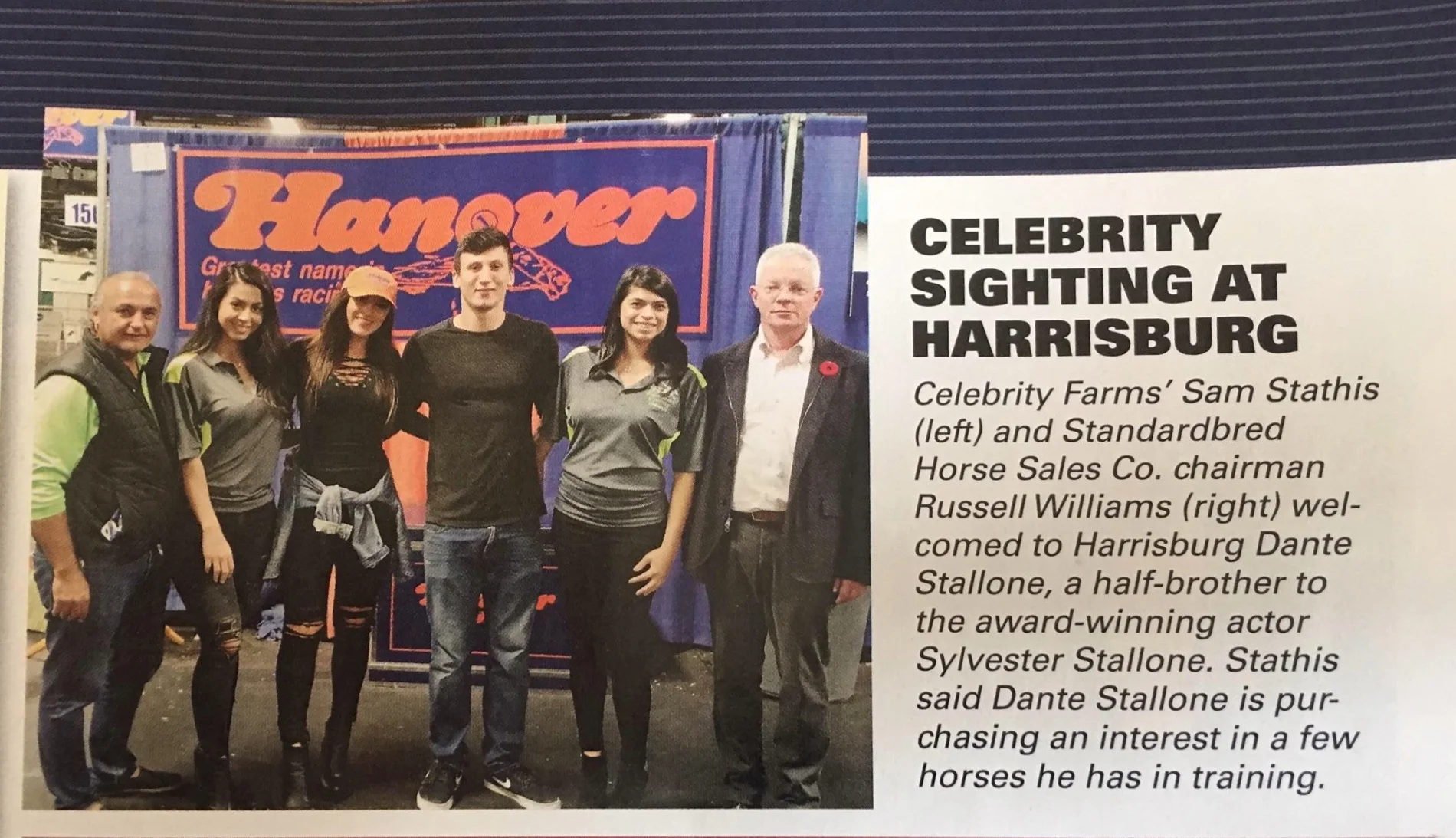 Celebrity Farms’ Sam Stathis and Standardbred Horse Sales Co. chairman Russell Williams welcomed to Harrisburg Dante Stallone, a half-brother of the award-winning actor Sylvester Stallone. Stathis said Dante Stallone is purchasing an interest in a few horses he has in training.